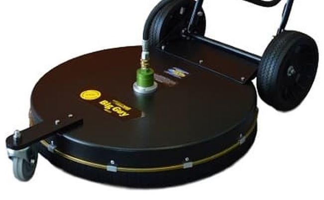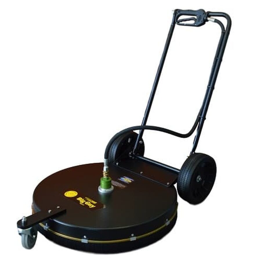 The Big Guy is built tough for the tough jobs. The Big Guy has a 28″ diameter powder-coated aircraft grade aluminum cover and handle, a pivoting 4” castor in the front and 2 fixed No-Flat 8” wheels on a steel axis assembly in the back to provide easy navigation. A heavy-duty nylon brush ensures that spray is confined to the surface area and not the operator or surrounding area. The fixed handle makes it easy to operate with one hand. The Signature Whisper Wash Swivel with two self-lubricating twin thrust bearings provide the power to utilize either a two or four tip spray bar & eliminates zebra striping.