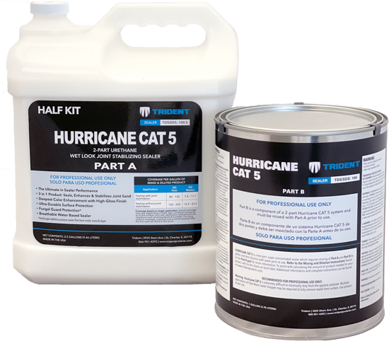 Hurricane CAT 5 2-Part Urethane Wet Look Sealer now available in a half kit option (3.5 gallons) – Hurricane CAT 5 is the ultimate in 2-part sealers made with a new generation urethane providing ultra-durable surface protection. Its Armor Bond joint stabilization hardens joint sand to prevent sand washout. It provides the deepest color enhancement with high-gloss finish using T3 True Tone Technology. It has an added antifungal that protects the sealer film from mold, moss and algae. Hurricane CAT 5 is a super concentrated water based film forming sealer that comes as a kit and requires mixing and dilution before use.