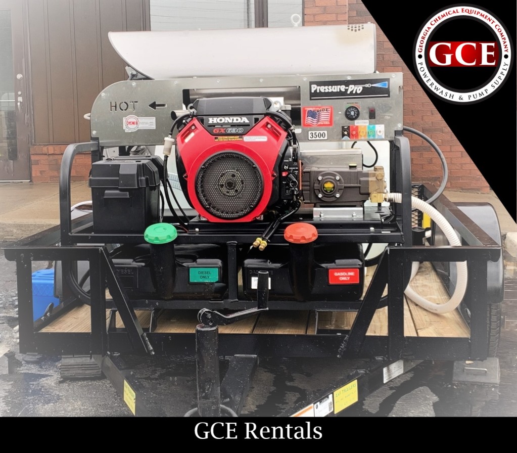 $230 PER DAY (24 HOUR RENTAL) MI-T-M HDC-3505 HOT WATER UNIT 3500 PSI @ 5 GPM, 225 GAL TANK, HOSE REEL WITH 100′ OF HOSE, GUN/WAND ASSY AND THREE NOZZLES. CHEMICAL INJECTOR SOLD SEPERATELY AND IS YOURS WHEN THE RENTAL IS COMPLETE. ALL MOUNTED TO A 5X8 SINGLE AXLE TRAILER. DO NOT ORDER THIS ONLINE, CALL TO BOOK. 770-921-0397